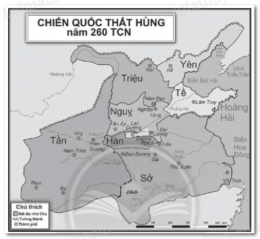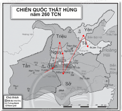 (Gợi ý: Các đường mũi tên đó xuất phát từ Hàm Dương (kinh đô nước Tần) đến kinh đô các nước. Trên đường mũi tên ghi chú lần lượt năm các nước bị tiêu diệt).