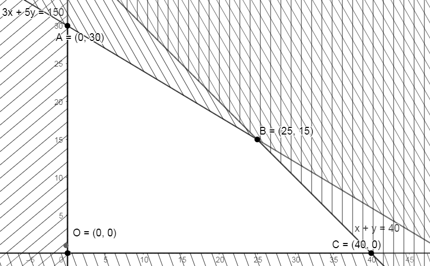 \(\left\{ \begin{array}{l}3x + 5y \le 150\\x + y \le 40\\x \ge 0\\y \ge 0\end{array} \right.\)
