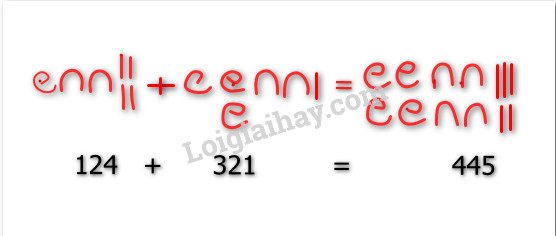 Dựa vào bảng chữ số của người Ai Cập dưới đây em hãy làm theo phép tính: 124+321=? và 1565-1243=? Theo cách viết của người Ai Cập cổ đại.
