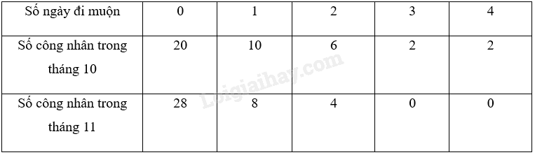 Trực ban ghi lại số ngày đi làm muộn của các công nhân một phân xưởng trong tháng 10 và tháng 11 ở bảng tần số sau.