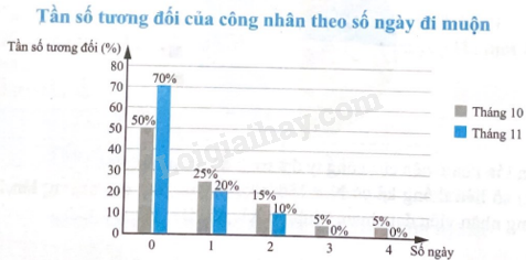 a) Hãy tính tần số tương đối của số ngày đi làm muộn của các công nhân trong tháng 10 và tháng 11.