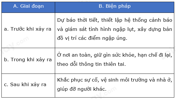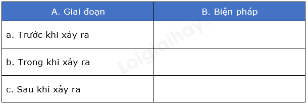 Dựa vào bảng 14.1 trong SGK, em hãy cho biết biện pháp phòng tránh bão/lũ/hạn hán/ngập lụt/mưa đá/... (có thể chọn một thiên tai hay xảy ra ở địa phương em để làm) ở 3 giai đoạn trước, trong và sau khi xảy ra thiên tai ấy.