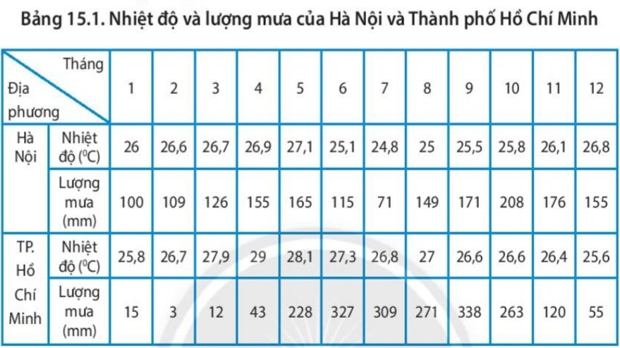 Hãy nhận xét nhiệt độ và lượng mưa của Hà Nội và Thành phố Hồ Chí Minh có điểm nào giống nhau? Điểm nào khác nhau?