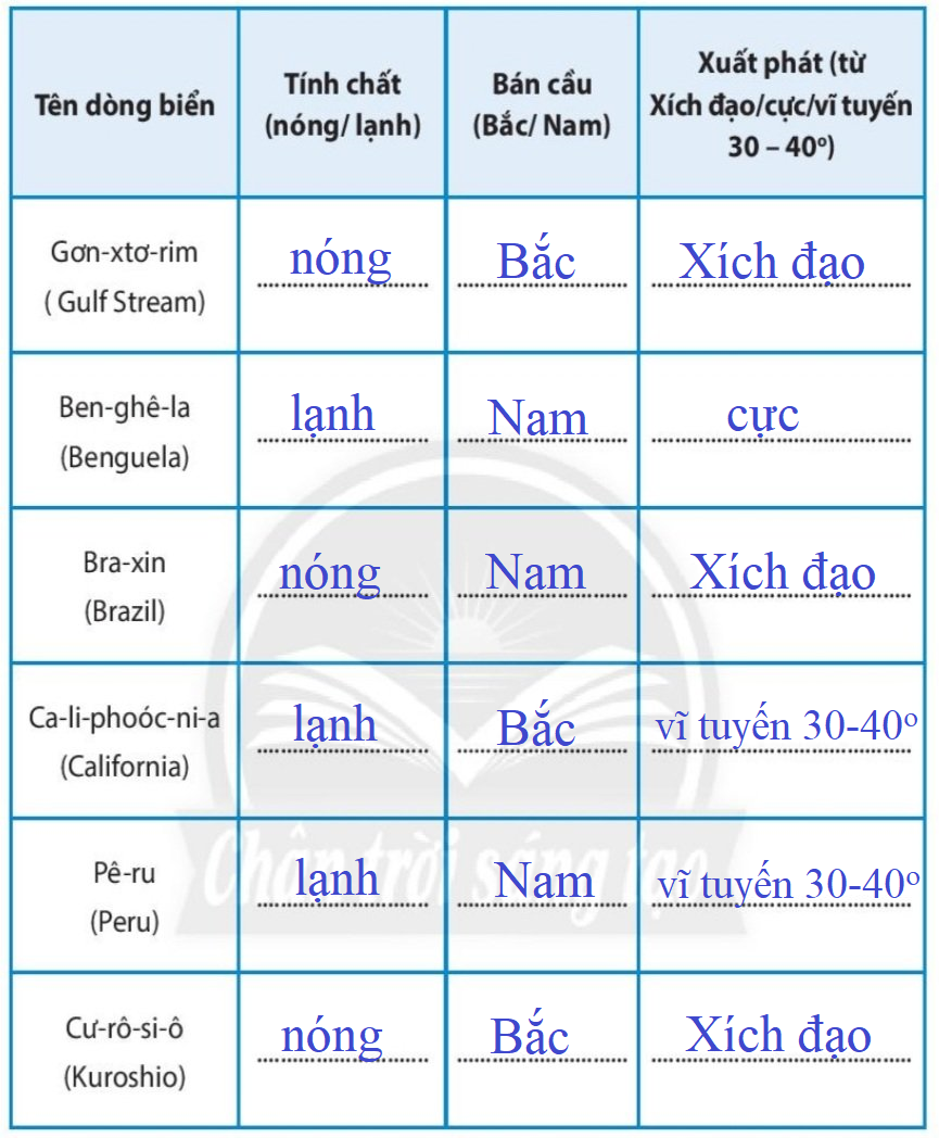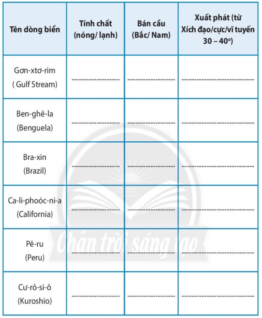 2. Dựa vào hình 18.4 trong SGK để hoàn thành bảng thông tin về các dòng biển sau: