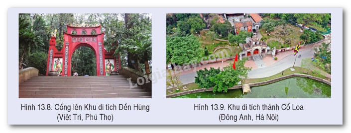 Dựa vào hình 13.8, hình 13.9 và các thông tin em tìm hiểu được, hãy đóng vai là một hướng dẫn viên du lịch để giới thiệu về khu di tích Đền Hùng và Khu di tích thành Cổ Loa?