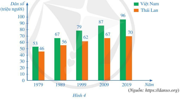 Biểu đồ cột kép ở Hình 4 biểu diễn dân số (ước tính) của Việt Nam và Thái Lan ở một số năm trong giai đoạn từ năm 1979 đến năm 2019.