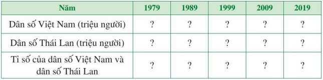 Muốn tính tỉ số của dân số Việt Nam và dân số Thái Lan ta lấy dân số Việt Nam chia dân số Thái Lan cùng năm.