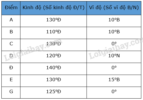 Dựa vào hình 1.2, hãy xác định tọa độ địa lí của các điểm A, B, C, D, Đ, E, G được đánh dấu trên bản đồ.