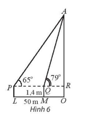Để xác định chiều cao của một tòa nhà cao tầng, một người đứng tại điểm M, sử dụng giác kế nhìn thấy đỉnh tòa nhà với góc nâng \(\widehat {RQA} = 79^\circ \), người đó lùi ra xa một khoảng cách \(LM = 50\) m thì nhìn thấy đỉnh tòa nhà với góc nâng \(\widehat {RPA} = 65^\circ \). Hãy tính chiều cao của tòa nhà, biết rằng khoảng cách từ mặt đất đến ống ngắm của giác kế đó là \(PL = QM = 1,4\) m (hình 6)
