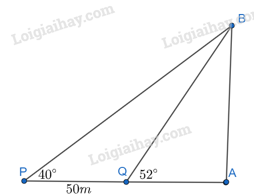 Hai chiếc tàu thủy P và Q cách nhau 50 m. Từ P và Q thẳng hàng với chân A của tháp hải đăng AB ở trên bờ biển, người ta nhìn chiều cao AB của tháp dưới các góc \(\widehat {BPA} = 40^\circ \) và \(\widehat {BQA} = 52^\circ \). Tính chiều cao của tháp hải đăng đó.