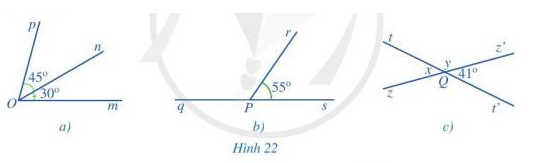 c) Ta có: \(\widehat {tQz} = \widehat {t'Qz'}\) (2 góc đối đỉnh), mà \(\widehat {t'Qz'} = 41^\circ \) nên \(\widehat {tQz} = 41^\circ \)