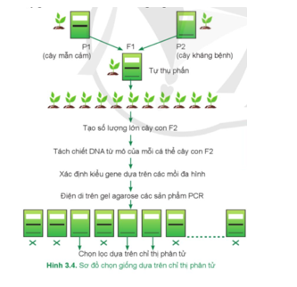 2. Quan sát Hình 3.4 và mô tả các bước cơ bản của phương pháp chọn giống cây trồng bằng chỉ thị phân tử.