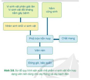Luyện tập: Mô tả quy trình sản xuất chế phẩm vi sinh vật hỗn hợp dạng viên nén dùng cho cây thông và cây bạch đàn ở Hình 3.6.