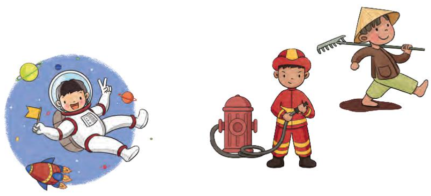 - Các bạn nhỏ trong tranh đang đóng vai các ngành nghề: phi hành gia, lính cứu hóa, nông dân, siêu nhân, cô giáo, phóng viên, quay phim.