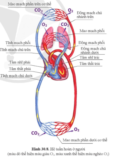 Quan sát hình 30.8: a) Nêu tên và chức năng các cơ quan của hệ tuần hoàn b) Mô tả đường đi của máu trong hai vòng tuần hoàn: vòng tuần hoàn nhỏ (vòng tuần hoàn phổi) và vòng tuần hoàn lớn (vòng tuần hoàn cơ thể) |
