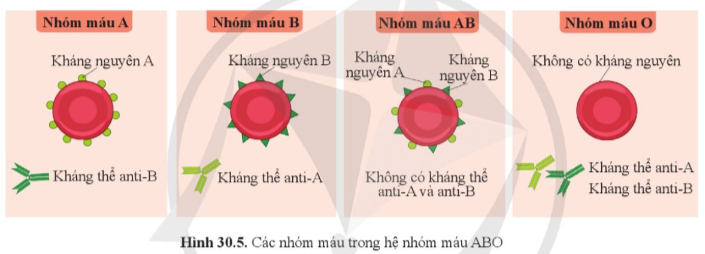 Quan sát hình 30.5 và cho biết tên các loại kháng nguyên, kháng thể ở mỗi nhóm máu A, B, AB và O |