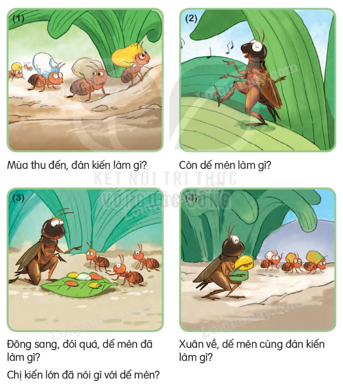 - Tranh 4: Xuân về, dế mèn cùng đàn kiến vui vẻ đi kiếm thức ăn.