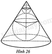 Một món đồ chơi có dạng như Hình 26. Vỏ ngoài món đồ chơi là một hình nón (bằng nhựa trong suốt) có bán kính đường tròn đáy là \(3\sqrt 3 \)cm và đường sinh là \(6\sqrt 3 \)cm. Trong hình nón là hai quả cầu (bằng thuỷ tinh) to và nhỏ, bán kính của chúng lần lượt là 3 cm và 1 cm. Tính tỉ số tổng thể tích của hai quả cầu và thể tích hình nón đó.
