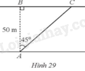 Một con sông có bề rộng AB = 50 m. Một chiếc thuyền đi thẳng từ vị trí A bên này bờ sông đến vị trí C bên kia bờ sông với góc tạo bởi phương AC và phương AB là \(\widehat {BAC} = 45^\circ \)(Hình 29). Hỏi độ dài đoạn thẳng BC là bao nhiêu mét?