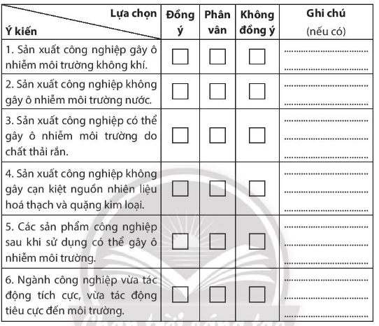 Em hãy đánh dấu (X) vào các ô tương ứng với các nhận định em cho là thích hợp khi đề cập đến tác động của công nghiệp tới môi trường