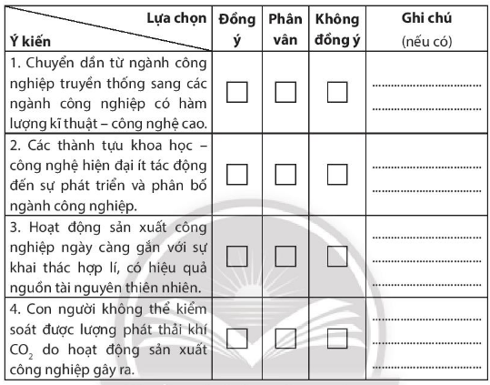 Em hãy đánh dấu (X) vào các ô tương ứng với các nhận định em cho là thích hợp khi đề cập đến định hướng phát triển ngành công nghiệp trong tương lai