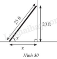 Một người lính cứu hoả dựng một chiếc thang dài 25 ft dựa vào tưởng với góc tạo bởi thang và phương nằm ngang là góc α. Biết đỉnh của chiếc thang cách mặt đất là 20 ft (Hình 30). Tính khoảng cách x từ chân thang đến chân tường và số đo góc α (làm tròn kết quả đến hàng đơn vị của độ).