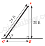 Độ dài thang \(GE = 25\)ft, góc tạo bỏi thang và phương nằm ngang là \(\widehat G = \alpha \), đỉnh thang cách mặt đất là \(EF = 25\)ft, khoảng cách từ chân tường đến chân thang là \(GE = x\).