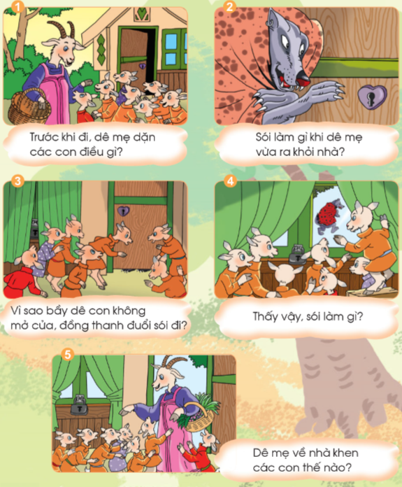 Tranh 1: Trước khi đi, dê mẹ dặn các con: Mẹ đi vắng các con ở nhà phải dè chừng lão sói đấy. Lão sói nói giọng khàn khàn, chân lão đen sì. Khi nào về, mẹ sẽ gõ cửa và hát thế này nhé: