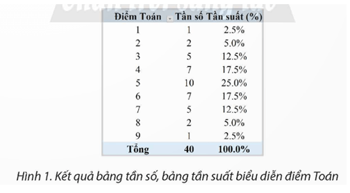 Yêu cầu: Sử dụng dữ liệu Bảng 1, hãy biểu diễn dưới dạng bảng tần số, bảng tần suất như Hình 1. Từ kết quả đó, em hãy đưa ra nhận xét về điểm số phổ biến nhất của môn Toán.