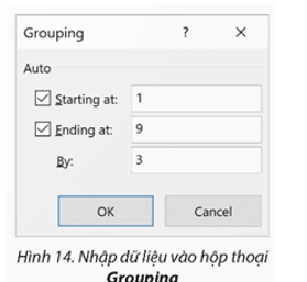 2b. Trong hộp thoại Grouping (Hình 14), tại mục Starting at nhập “1”, mục Ending at nhập “9” (lấy giá trị nhỏ nhất và lớn nhất trong bảng tần số) và mục By nhập “3” (số lượng dữ liệu điểm ở mỗi nhóm là 3). Nháy chọn OK để được kết quả bảng tần số ghép nhóm như Hình 15.