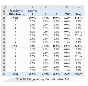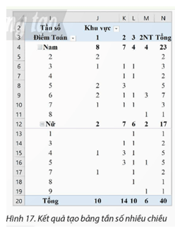 2. Chọn vào vùng dữ liệu chứa kết quả, trong hộp thoại PivotTable Fields, kéo thả cột Giới tính xuống vùng Rows (nằm phía trên cột Điểm Toán) để tạo bảng tần số nhiều chiều như Hình 17.