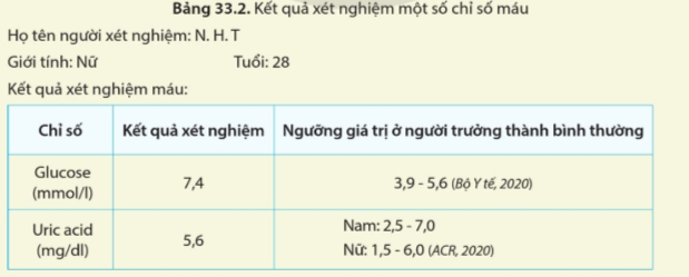 LT 2: Một người phụ nữ 28 tuổi có kết quả một số chỉ số xét nghiệm máu thể hiện ở bảng 33.2. Em hãy nhận xét về các chỉ số này. Theo em người này cần chú ý gì trong khẩu phần ăn ?