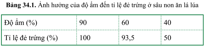 Câu hỏi 4 Từ bảng 34.1, nhận xét ảnh hưởng của độ ẩm đến sinh sản ở sâu non ăn lá lúa.