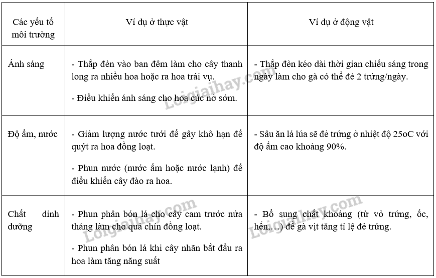 Câu hỏi 8 Quan sát hình 34.2, lấy ví dụ về điều khiển sinh sản ở sinh vật bằng điều chỉnh các yếu tố môi trường theo mẫu bảng sau: