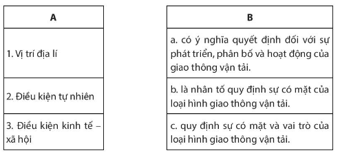 Sản phẩm của ngành giao thông vận tải là. Tiêu chí nào không được sử dụng để đánh giá dịch vụ vận tải? Ảnh hưởng của điều kiện tự nhiên đến sự phát triển và phân bố ngành giao thông vận tải thể hiện qua ý nào sau đây?