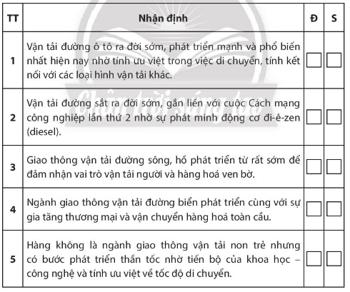 Những nhận định sau đây về tình hình phát triển các ngành giao thông vận tải là đúng (Đ) hay sai (S)? Hãy đánh dấu (X) vào các ô tương ứng bên cạnh mỗi nhận định