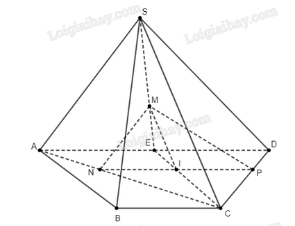 Sử dụng định lí Thales, do \(\frac{{AN}}{{AC}} = \frac{{DP}}{{DC}}\) nên \(NP\parallel AD\), suy ra \(NP\parallel BC\) và \(NP\parallel \left( {SBC} \right)\). Gọi \(I\) là giao điểm của \(NP\) và \(EC\). Áp dụng định lí Thales ta suy ra \(\frac{{EI}}{{EC}} = \frac{1}{3}\), từ đó chứng minh được \(IM\parallel SC\) và \(IM\parallel \left( {SBC} \right)\), rồi suy ra điều phải chứng minh.