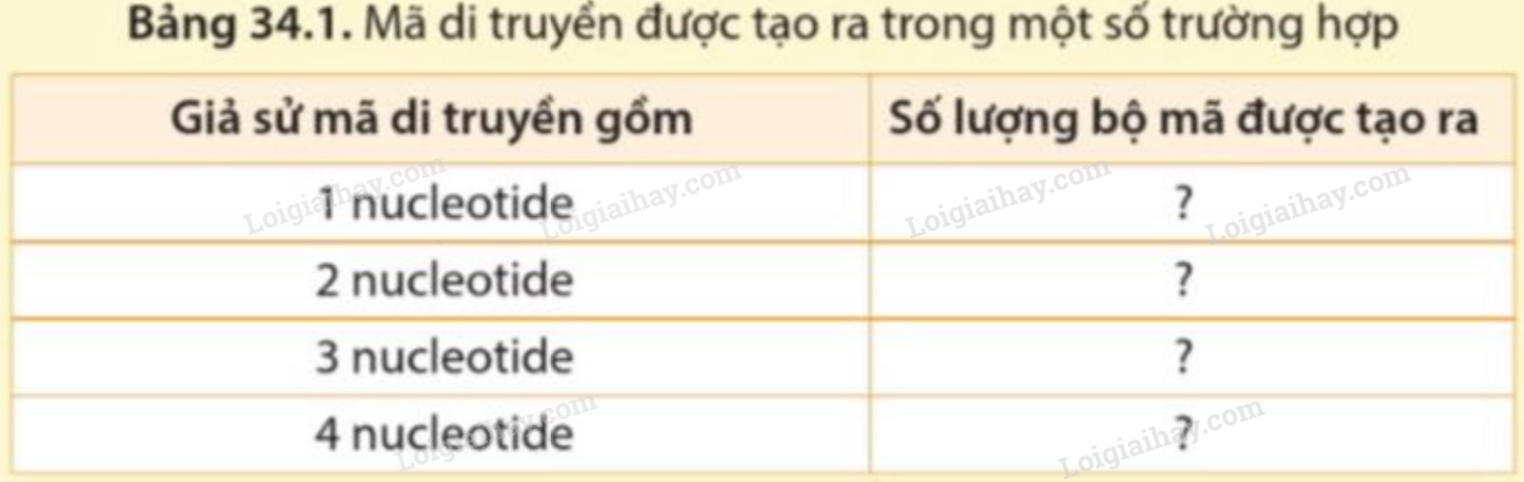 Phân tử mRNA được cấu tạo từ 4 loại nucleotide. Các nucleotide đứng riêng hoặc liền kề nhau có thể tạo nên một bộ mã di truyền quy định một amino acid. Biết các sinh vật đề cần khoảng 20 loại amino acid để cấu tạo nên protein. Hãy xác định số lượng mã di truyền trong các trường hợp ở bảng 34.1