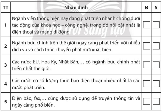Những nhận định sau đây về tình hình phát triển các ngành bưu chính viễn thông là đúng (Đ) hay sai (S)? Hãy đánh dấu (X) vào các ô tương ứng bên cạnh mỗi nhận định