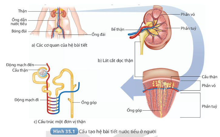 | Đọc đoạn thông tin trên kết hợp quan sát Hình 35.1, kể tên các cơ quan của hệ bài tiết nước tiểu và các bộ phận chủ yếu của thận. |