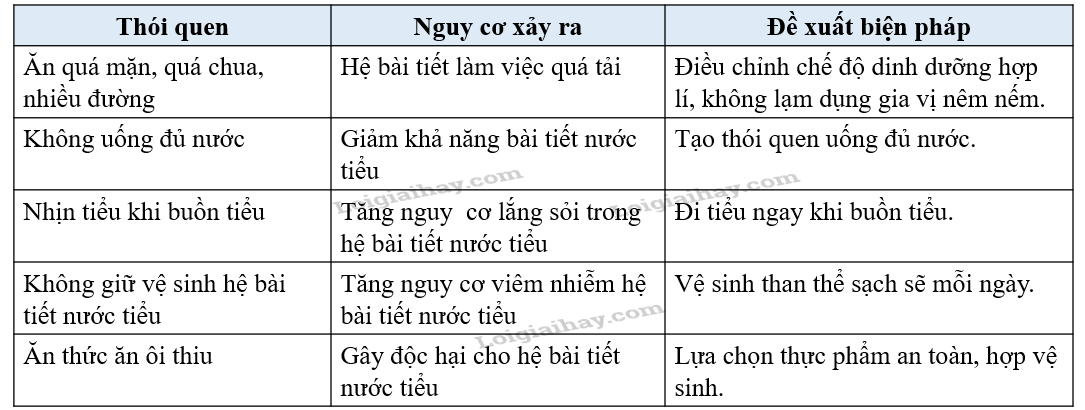 | Đọc thông tin trong Bảng 35.1 và đề xuất biện pháp phù hợp để bảo vệ hệ bài tiết rồi hoàn thành theo mẫu Bảng 35.1. |