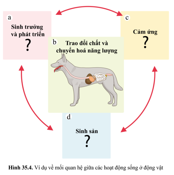 Luyện tập 2 Quan sát hình 35.4, lấy ví dụ cho mỗi hoạt động sống ở chó. Nêu mối quan hệ giữa các hoạt động sống đó.