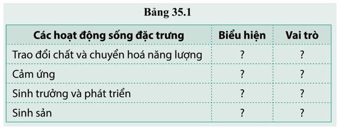 Luyện tập 3 Nêu biểu hiện và vai trò của bốn hoạt động sống đặc trưng cho cơ thể sinh vật theo bảng 35.1 .