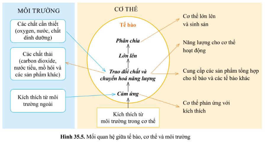 Câu hỏi 5 Quan sát hình 35.5, phân tích mối quan hệ giữa các hoạt động trong tế bào và cơ thể. Từ đó, chứng minh mối quan hệ giữa tế bào với cơ thể và môi trường.