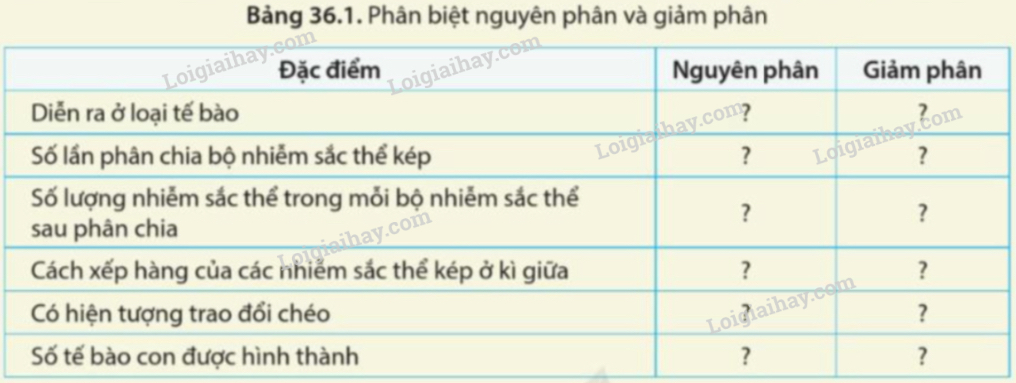 Quan sát hình 36.1 và 36.2, phân biệt nguyên phân và giảm phân theo gợi ý bảng 36.1.