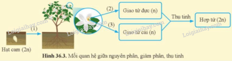 Quan sát hình 36.3, vị trí được đánh số (1), (2) và (3) tương ứng với nguyên phân hay giảm phân. Từ đó nêu mối quan hệ giữa nguyên phân, giảm phân và thụ tinh trong việc duy trì bộ NST qua các thế hệ ở các loài sinh sản hữu tính.