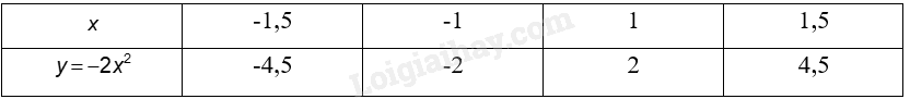 Đồ thị hàm số \(y = - 2{x^2}\) là đường parabol đi qua 5 điểm \(\left( { - 1,5; - 4,5} \right);\left( { - 1; - 2} \right);\left( {0;0} \right);\left( {1; - 2} \right);\left( {1,5; - 4,5} \right)\)