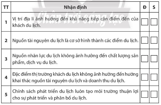 Những nhận định sau đây về các nhân tố ảnh hưởng đến sự phát triển và phân bố ngành du lịch là đúng (Đ) hay sai (S)? Hãy đánh dấu (X) vào các ô tương ứng bên cạnh mỗi nhận định