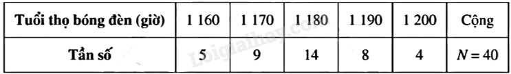 Một công ty sản xuất bóng đèn kiểm tra định kì bằng cách thắp thử nghiệm 40 bóng đèn để kiểm tra tuổi thọ (đơn vị: giờ). Kết quả của cuộc thử nghiệm được thống kê như sau: