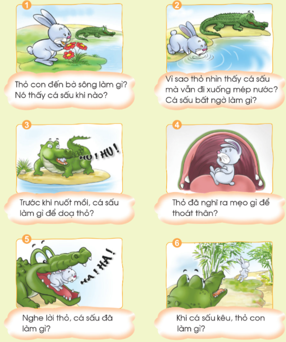 Tranh 1: Thỏ con đến bờ sông để ăn cỏ. Thỏ con thấy cá sấu khi nó lần xuống sông uống nước.